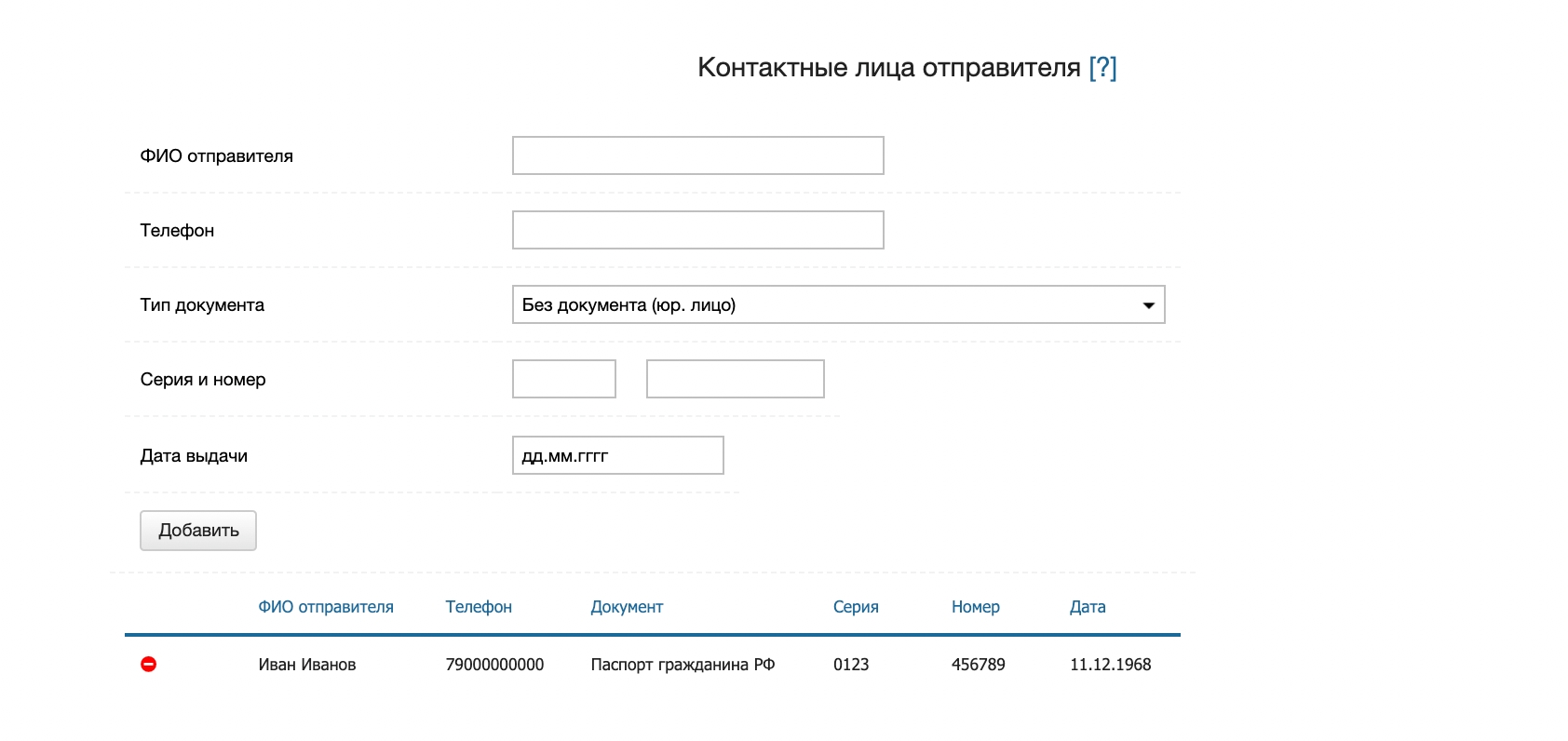 Для отправки груза в Деловых Линиях физ.лицами требуется указать данные контактного лица отправителя: