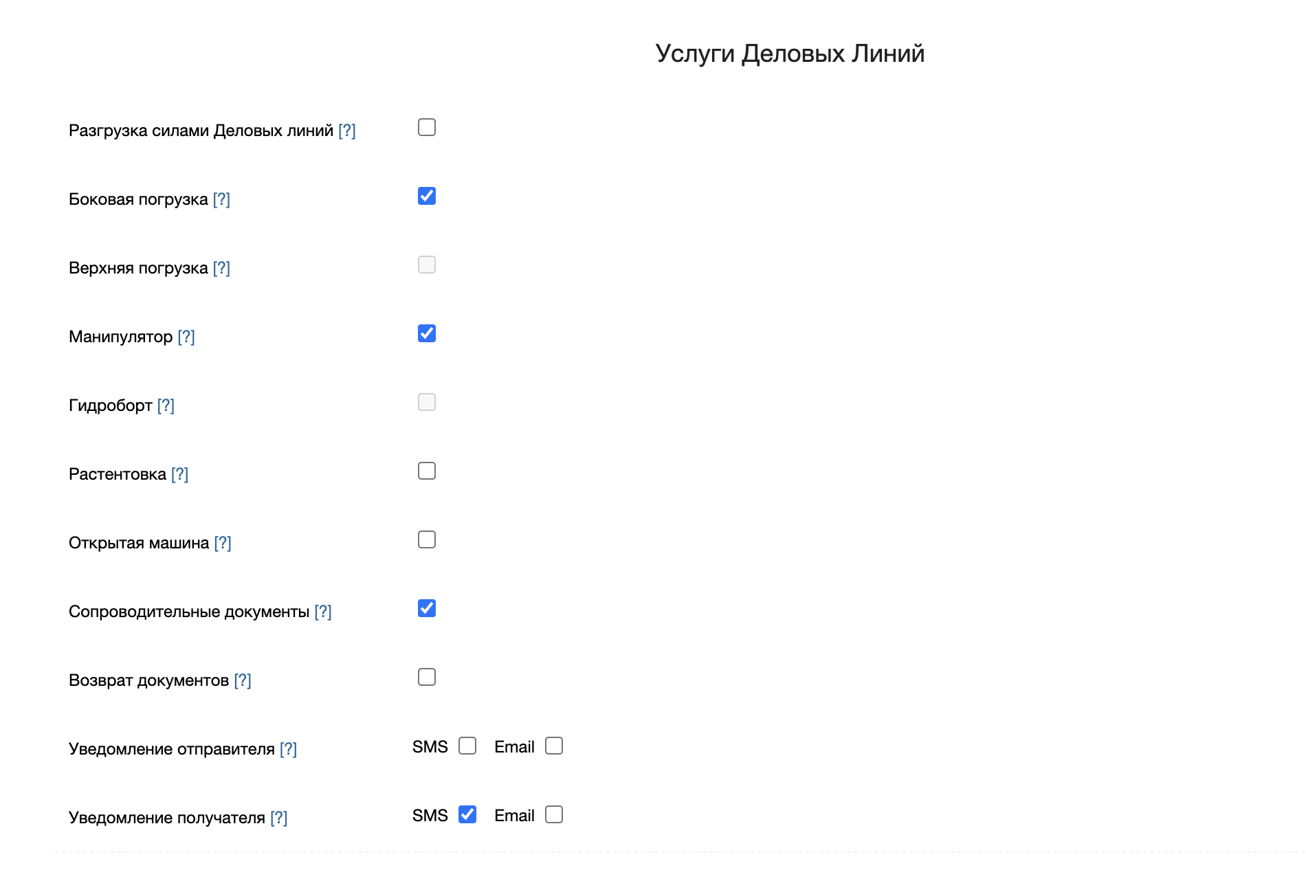 Услуги Деловых Линий, которые будут учитываться при создании накладной.