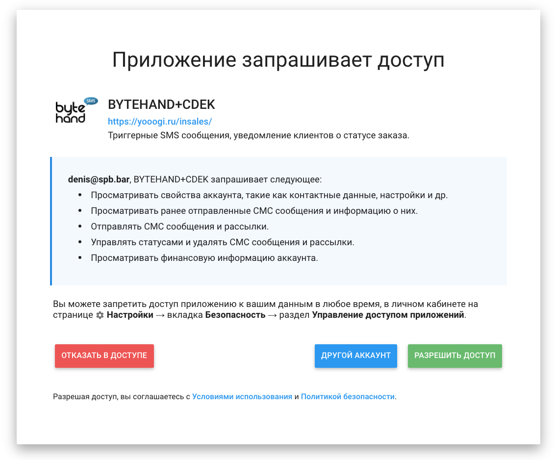 После предоставление доступа приложению, вы можете включить уведомления по SMS и выбрать подпись отправителя. Подробнее читайте в документации Bytehand