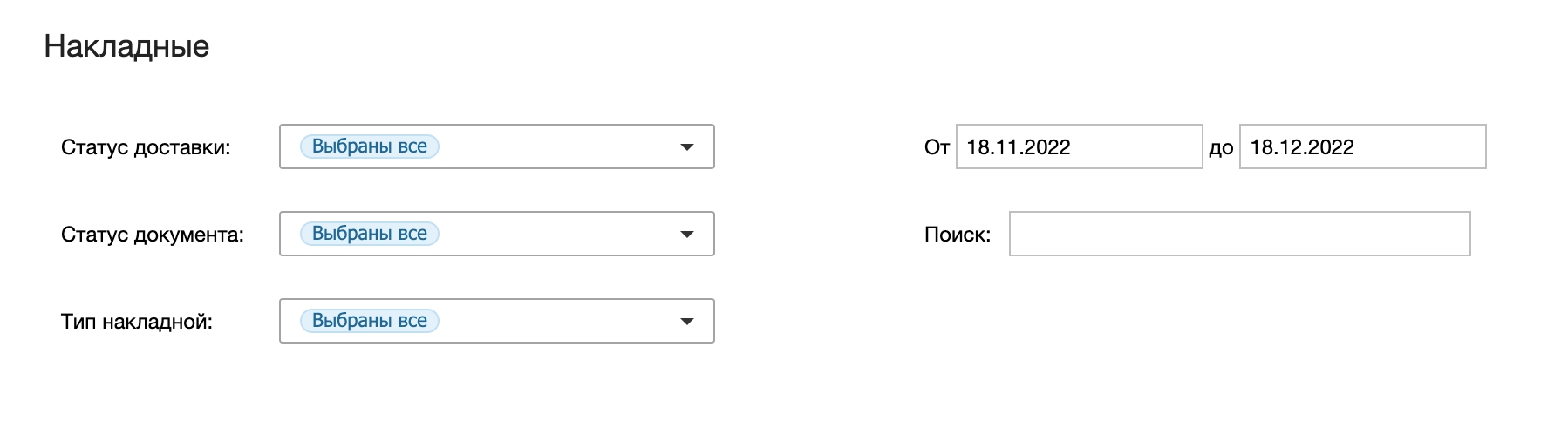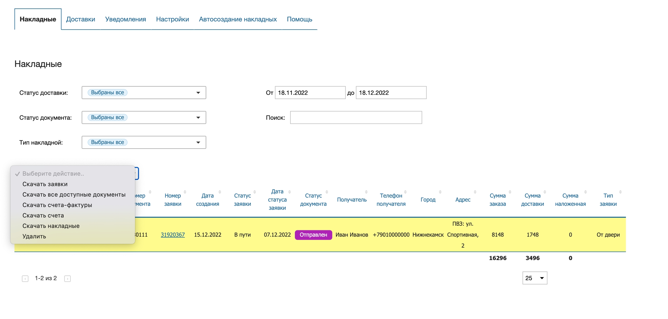 Печатные формы можно скачивать как единично, кликая на номер накладной, так и массово, выделив нужные накладные галочками и выбрав Cкачать заявки в выпадающем меню.