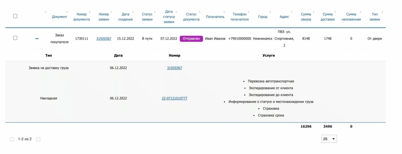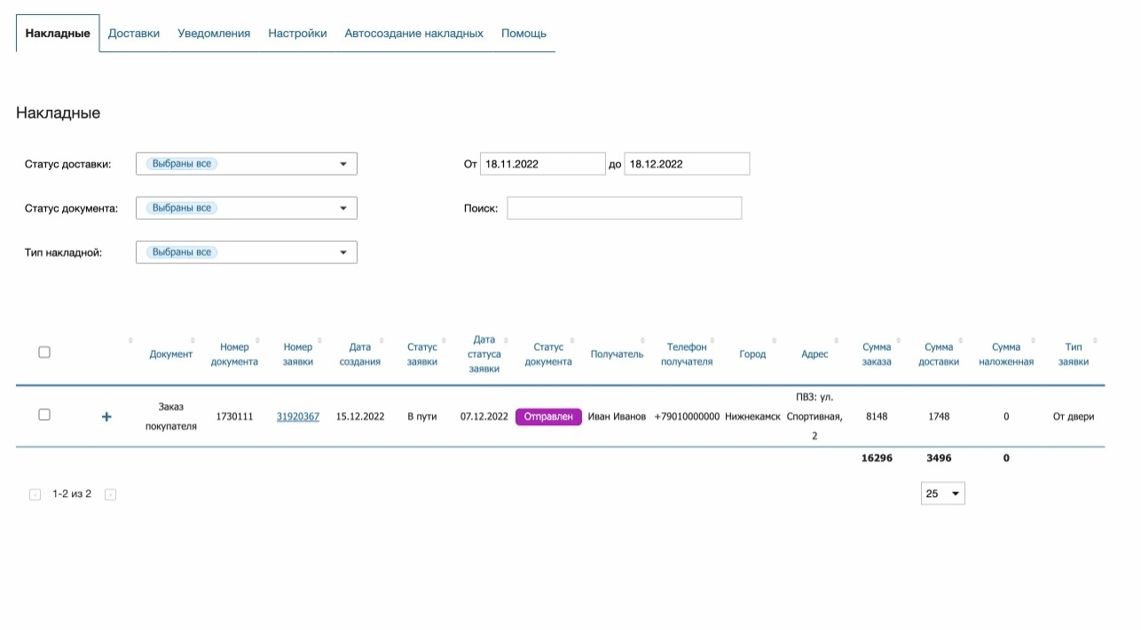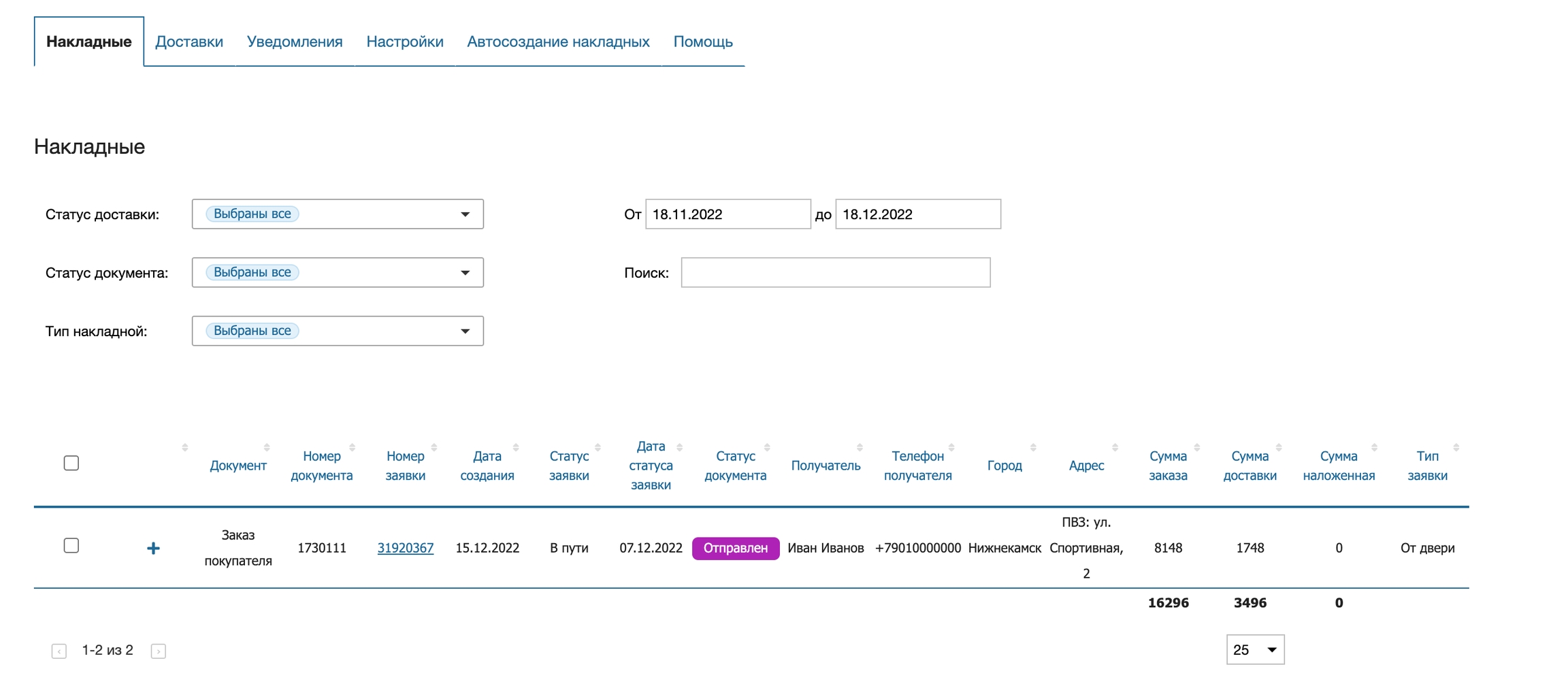 Во вкладке Накладные отображаются все созданные через виджет и автоматическое создание накладные, их текущие статусы, данные по доставке, суммарные стоимости наложенного платежа и т.д.