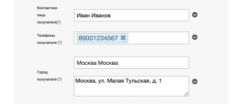 Имя контактного лица отправителя и данные его документов. Поле обязательно для заполнения, если не указан ИНН юр. лица отправителя. По клику на иконку ⬇️ разворачивается дополнительное меню с данными документа контактного лица.