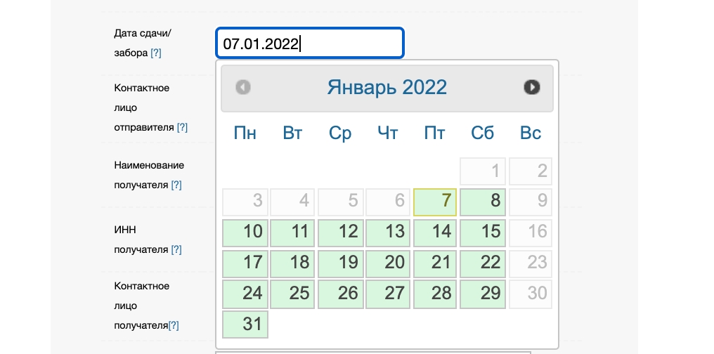 Пользователю предлагается выбрать в календаре предполагаемую дату сдачи или желаемую дату забора. Зеленым подсвечены доступные даты, серым - недоступные.