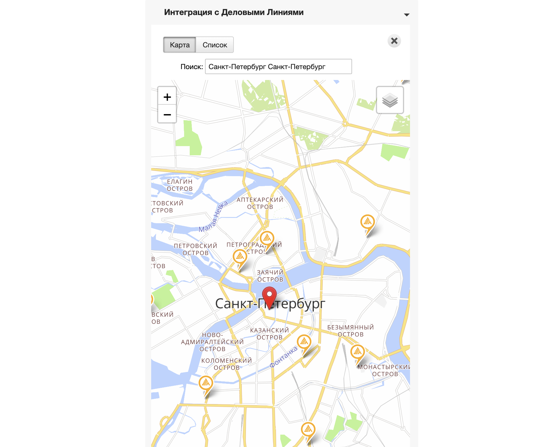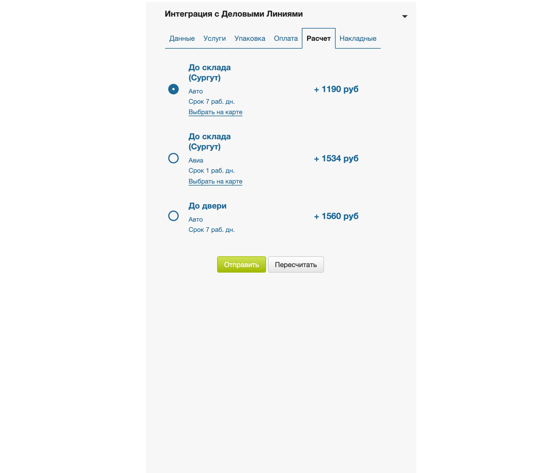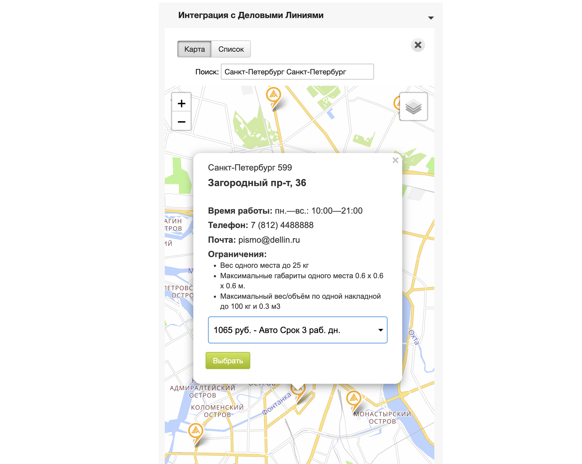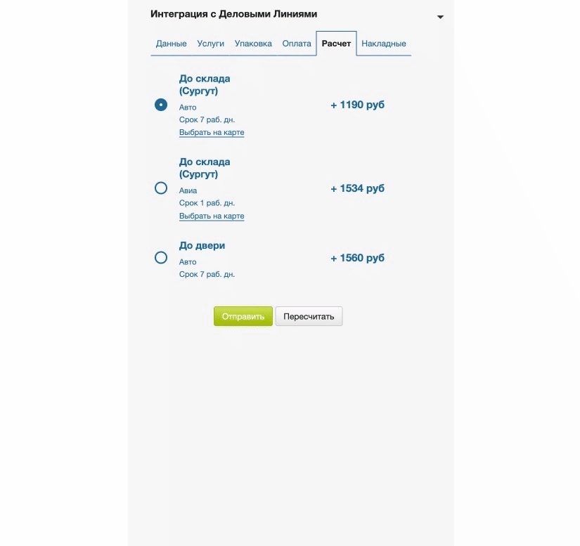 В этой части виджета выводятся точки ПВЗ и стоимость по тарифам, доступным для отправления по заданным параметрам из вкладки Данные заказа
