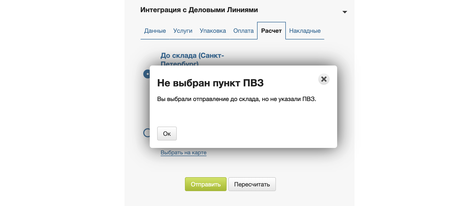 Если пользователь не выберет точку при заказе по тарифу До склада, он получит сообщение с предупреждением, а заказ не оформится.
