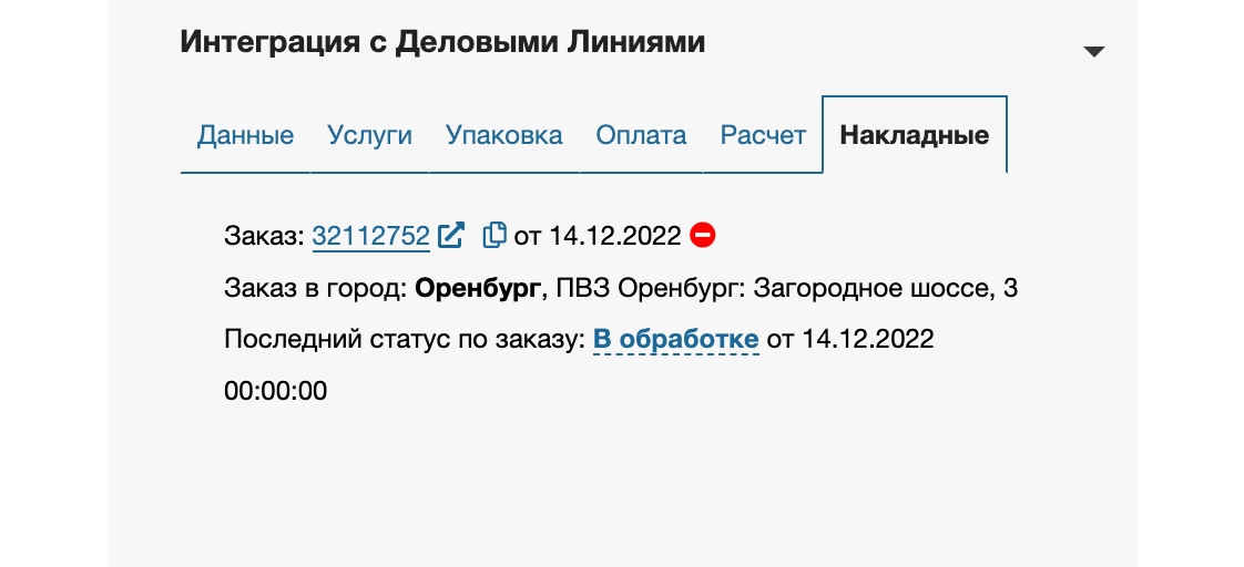 В этой части виджета выводятся все созданные по заказу накладные Деловых Линий, а также их последний статус и краткая информация