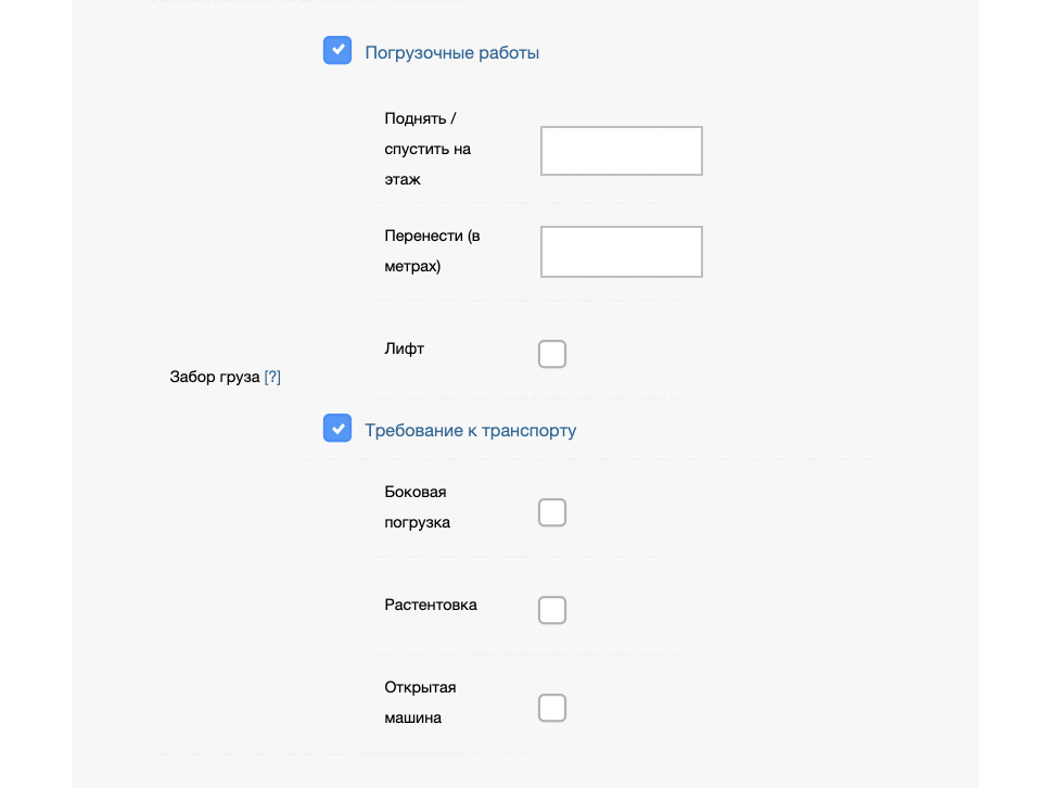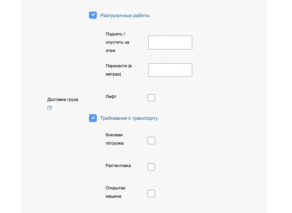 При разгрузке вы можете обозначить требования к транспорту. В зависимости от характеристик груза, города отправления и времени погрузки услуга может тарифицироваться или нет. При включении опций - стоимость доставки автоматически пересчитается с учетом услуг.