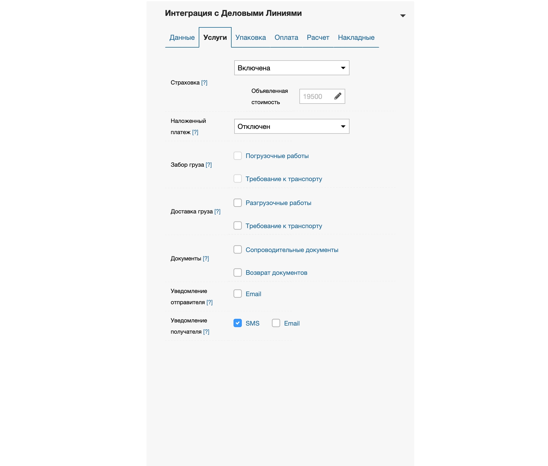 В данной части виджета указывается информация по дополнительным услугам Деловых Линий, которые будут применены к накладной. Доступность услуг может зависеть от параметров груза, города получателя и города получателя. Так же включение услуг напрямую влияет на стоимость и запускает перерасчет стоимости доставки в разделе виджета Расчет